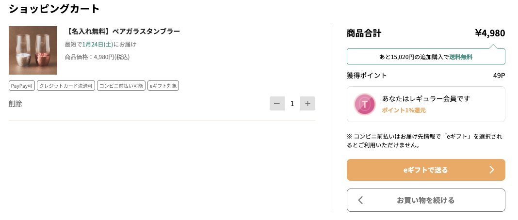 カート画面では、「eギフトで送る」ボタンが表示されます。